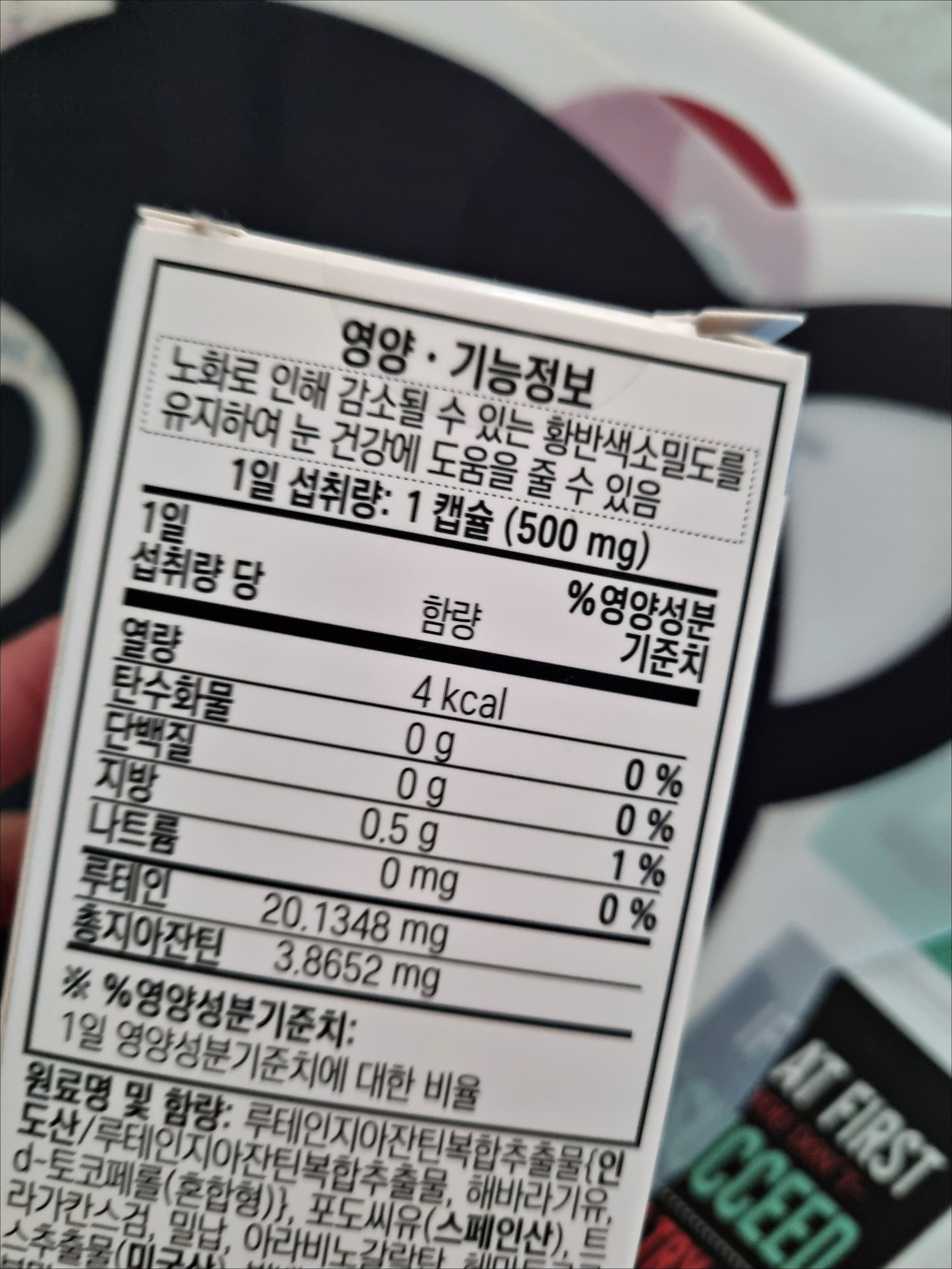 이 제품은 눈 건강을 위해 특별히 설계된 건강기능식품으로, 포장 박스에 큼직하게 '루테인 지아잔틴 복합추출물 제품'이라고 표기되어 있었어요. 눈의 가장 중요한 부분인 황반을 구성하는 핵심 성분인 루테인과 지아잔틴이 주원료로 들어있는데요. 한 상자에 캡슐 30정이 들어있어서 딱 한 달 분량이더라고요. GMP 인증 마크까지 붙어있어서 안심하고 섭취하고 있고, 개별 블리스터 포장이라 위생걱정없었어요. 검은색의 작은 연질 캡슐이라 물과 함께 목 넘김도 아주 부드러웠답니다.