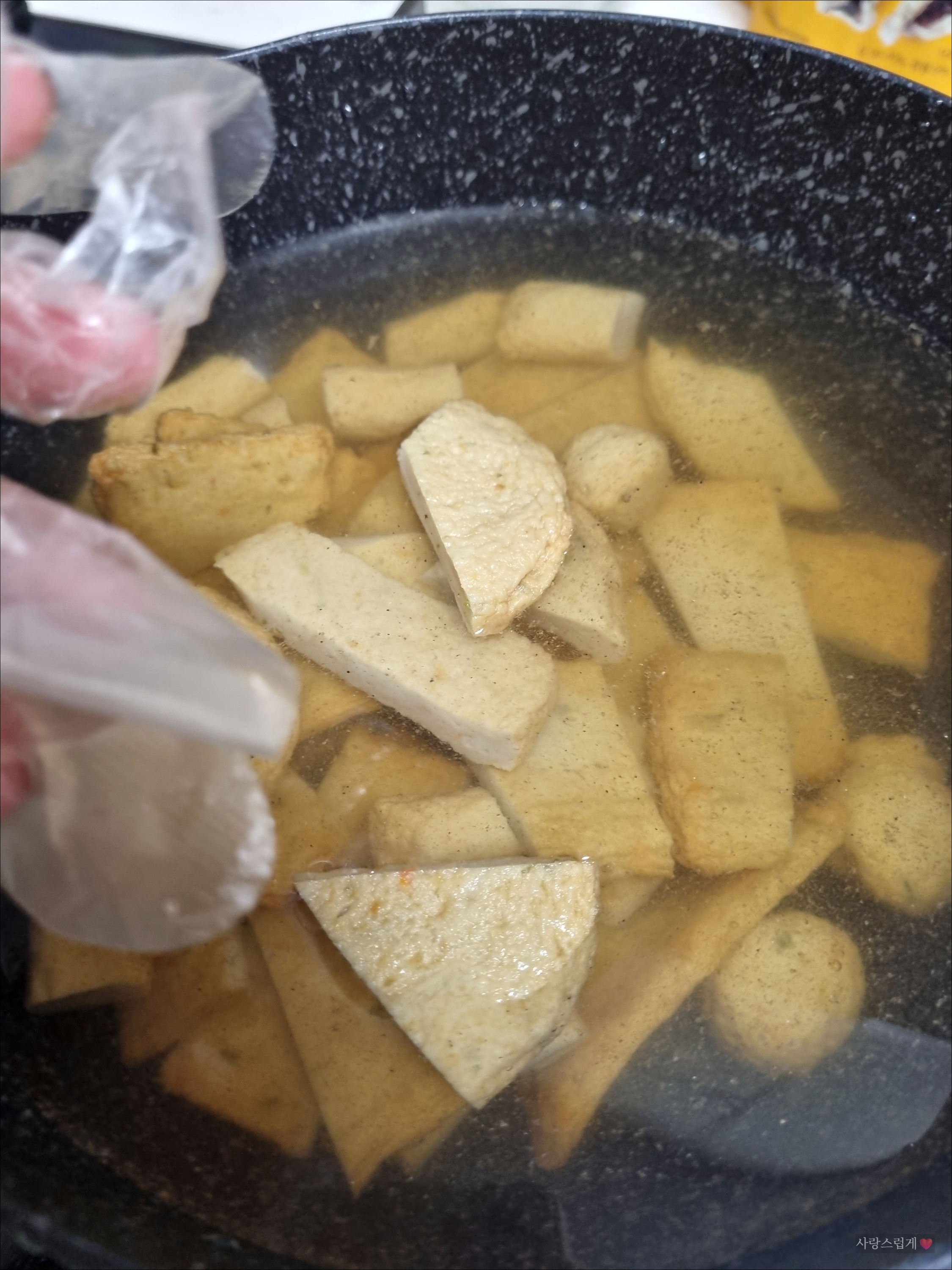 여기에 포장된 여러 모양의 어묵들을 모두 넣어주는데요. 먹기 좋은 크기로 잘라서 넣어줍니다.