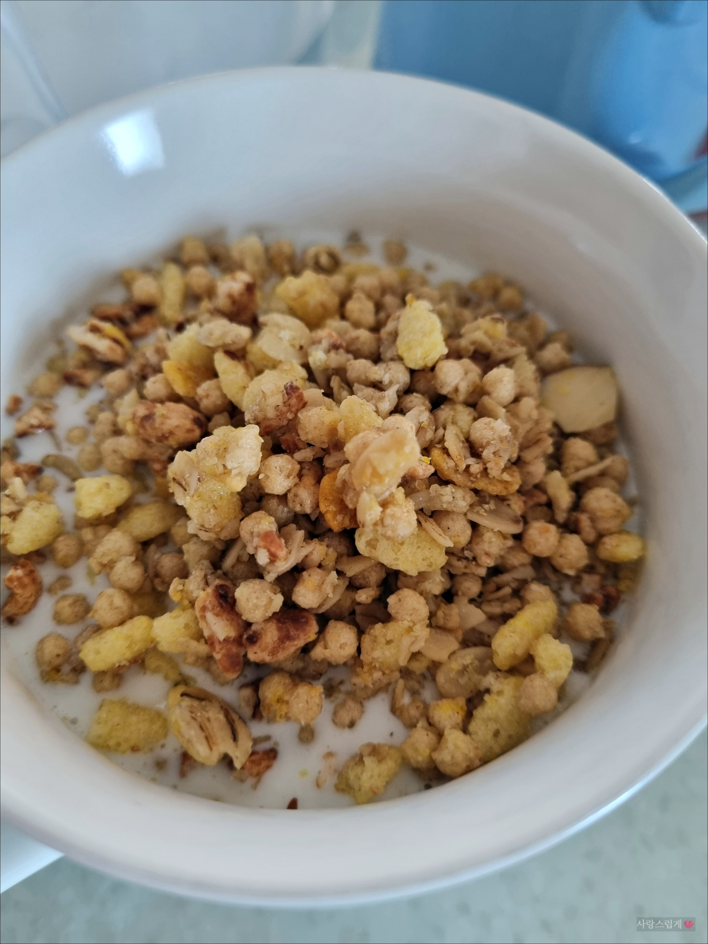 맛의 측면에서는 인위적인 단맛보다는 매우 고소한 맛이 지배적이었어요. 통곡물과 아몬드(9.2% 함유), 그리고 피칸이 선사하는 자연스러운 고소함과 은은한 단맛 덕분에 질리지 않고 꾸준히 먹을 수 있었어요. 균형 잡힌 맛 덕분에 저는 주로 차가운 우유나 두유에 말아 먹거나, 플레인 요거트 위에 얹어 바삭한 식감을 더하는 방식으로 즐겨 먹는데요. 요거트와 함께 먹을 때 그래놀라의 고소함이 부드러운 요거트와 어우러져 훌륭한 건강 간식이 되더라고요.