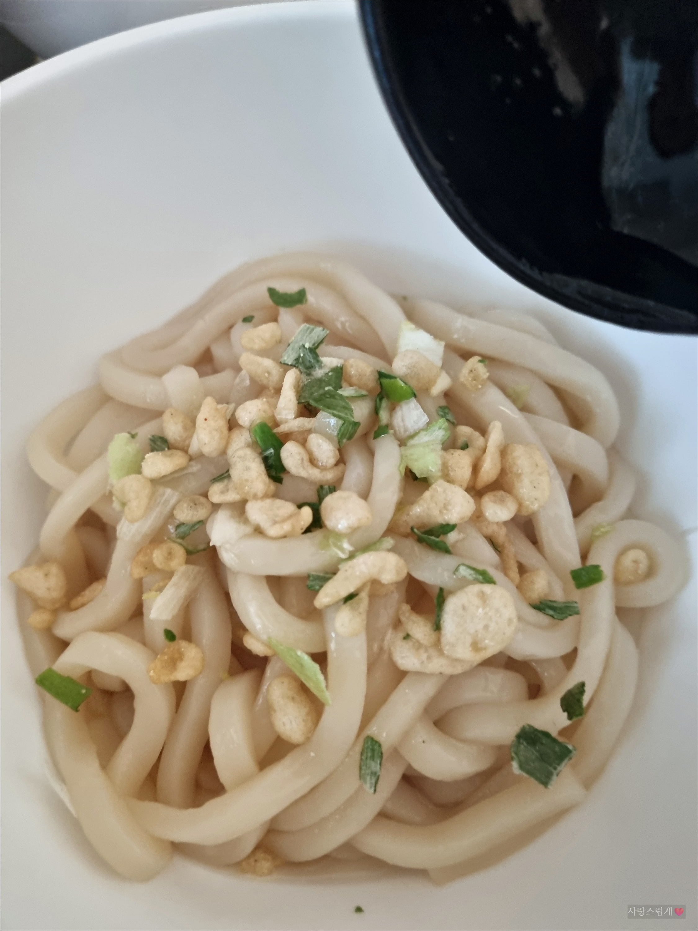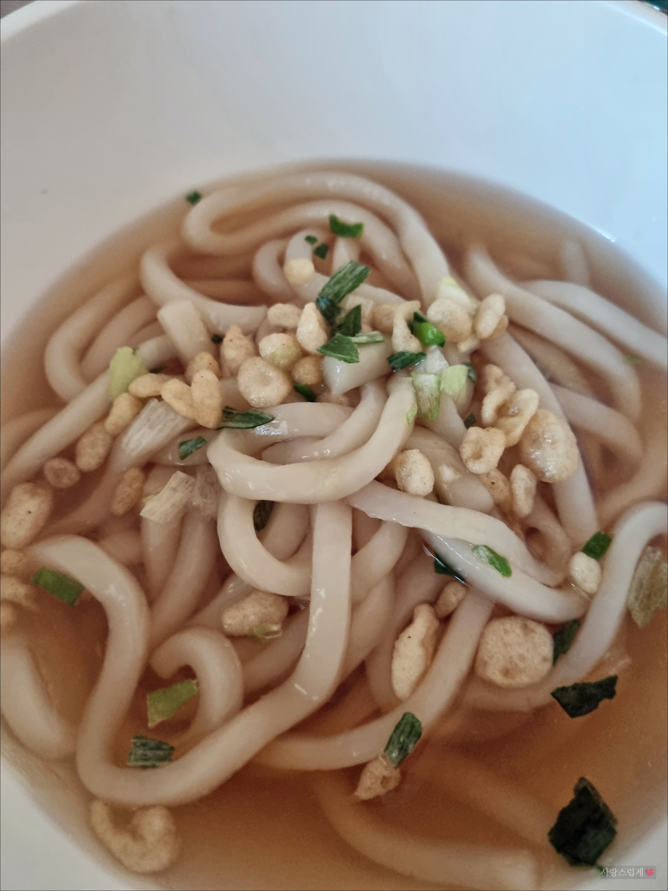그리고 이 우동의 화룡점정은 바로 고소한 튀김볼입니다! 국물에 눅진하게 젖은 튀김볼을 톡 터뜨려 면과 함께 먹으면, 그 고소함이 맑은 국물에 퍼지면서 감칠맛을 확 올려줍니다. 여기에 건더기로 들어있는 파가 색감과 향을 더해주니, 별다른 재료 추가 없이도 완벽한 한 그릇이 완성됩니다.
