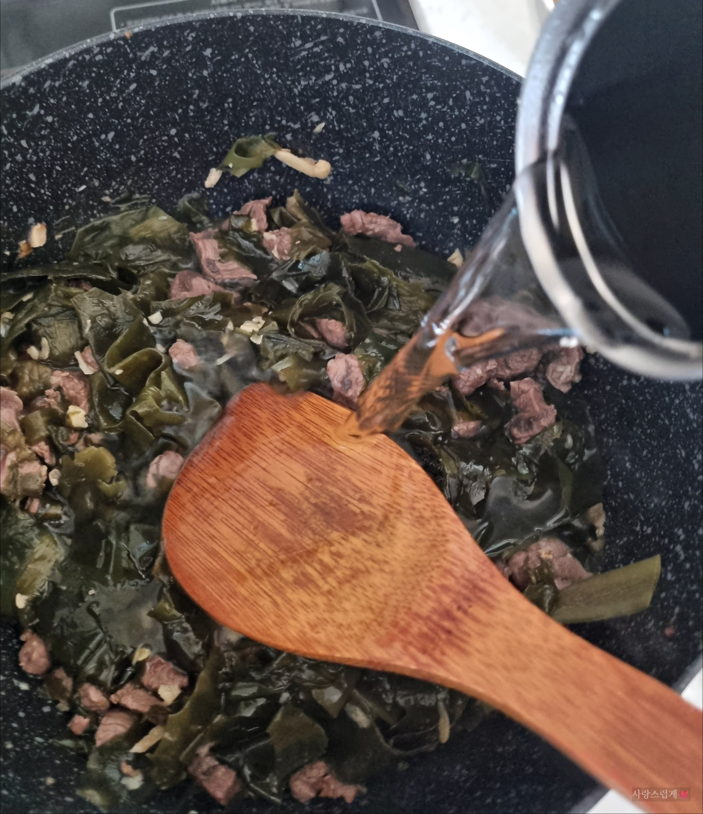 미역이 흐물흐물하게 불면 물기를 꼭 짜서 볶고 있던 고기에 넣고 함께 달달 볶아요. 푸른 미역에 간장과 참기름이 스며들면서 미역 특유의 구수한 향이 확 올라올 때, 쌀뜨물을 쓰면 국물이 훨씬 깊고 진해지는 마법을 알기에 빼놓을 수 없는 비법인데, 저희 남편은 쌀뜨물로 하는 걸 싫어하는터라 생수를 부어줍니다.