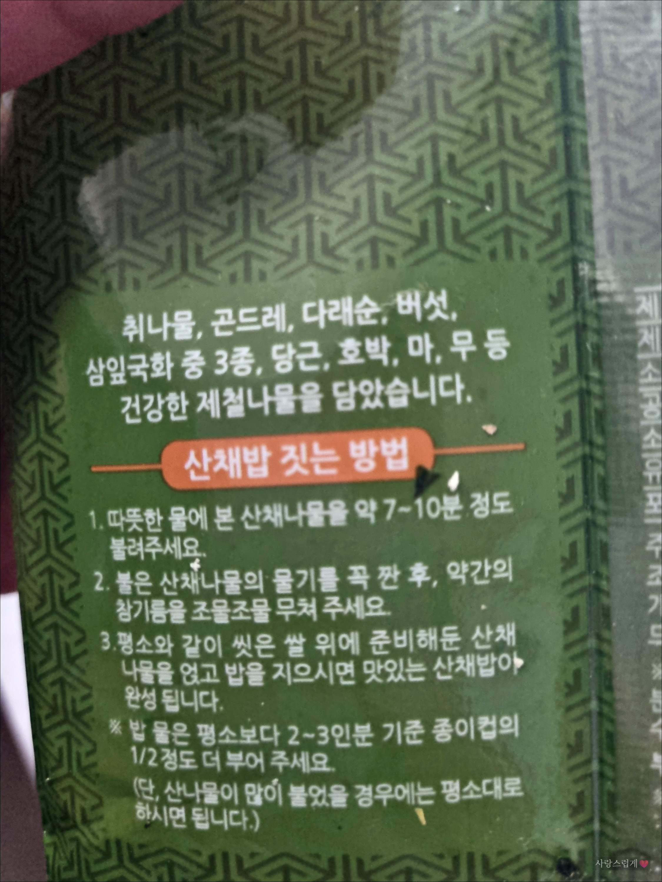 - 제품마다 나물 종류나 양념의 강도가 다를 수 있으니 포장 뒷면 원재료명과 영양성분을 확인해 보시는 게 좋아요.