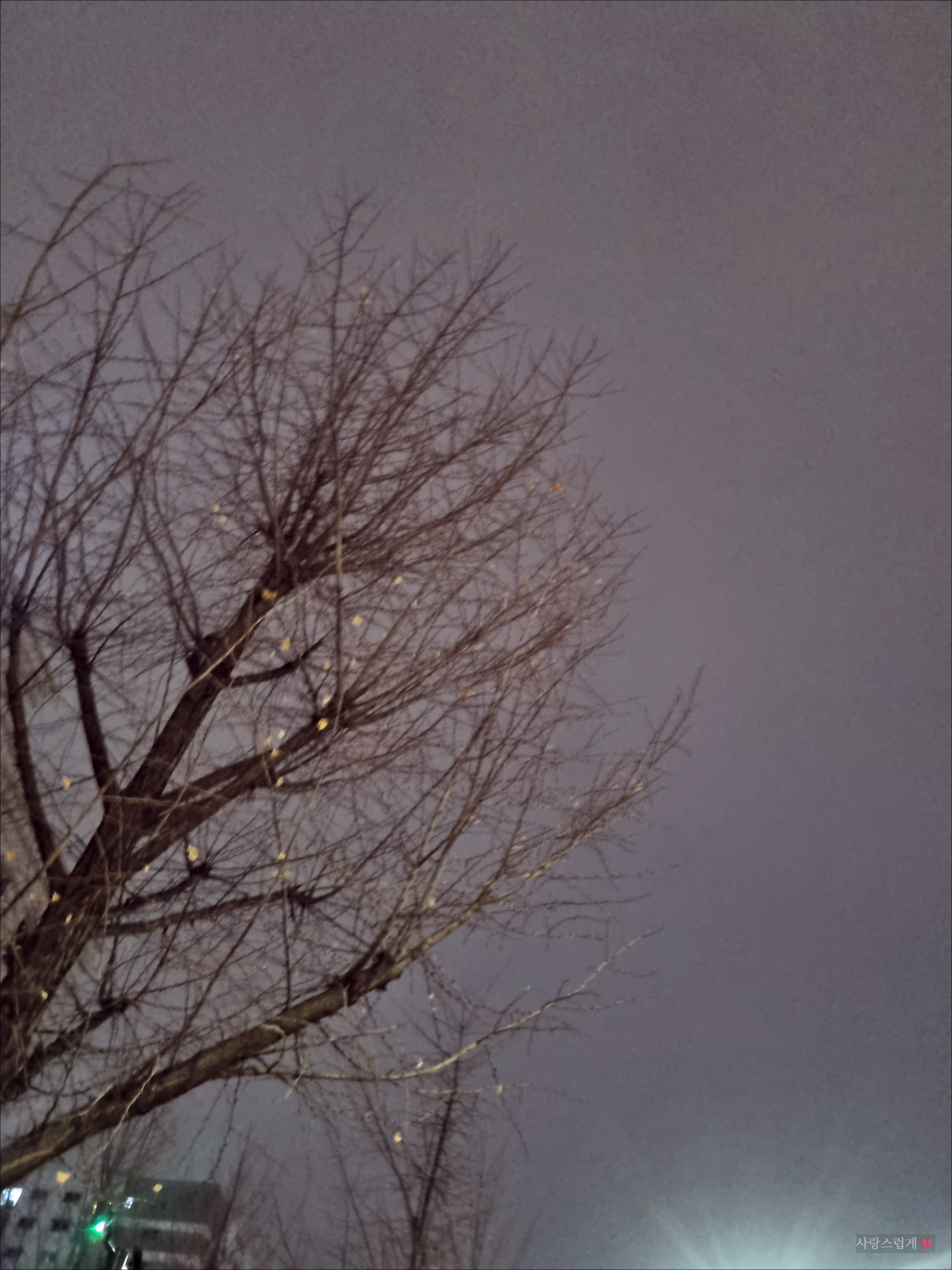 아주 늦은 밤, 가로등이 희미하게 번지는 거리 한가운데에서 이 나무를 마주했을 것만 같은 느낌이 들어요. 사진을 보면 가을의 마지막 숨결이 겨울로 넘어가는 바로 그 지점의 공기가 고스란히 느껴져요. 남아 있는 잎 몇 장이 마치 “아직은 떨어지기 싫어요” 하고 버티는 것 같은데, 공기 속에는 이미 겨울의 냄새가 차갑게 스며 있고 하늘도 잔잔하게 굳어 있어요.